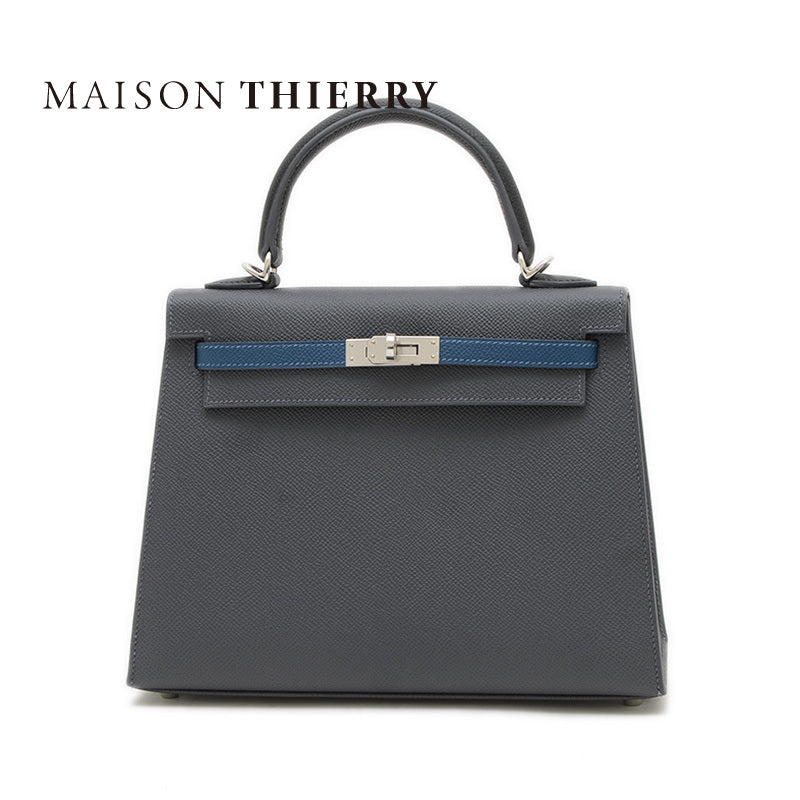 ケリー25 外縫い トリコロール エプソン アルドワーズ/ブラック/ブルータイ K刻印 ハンドバッグ レディース